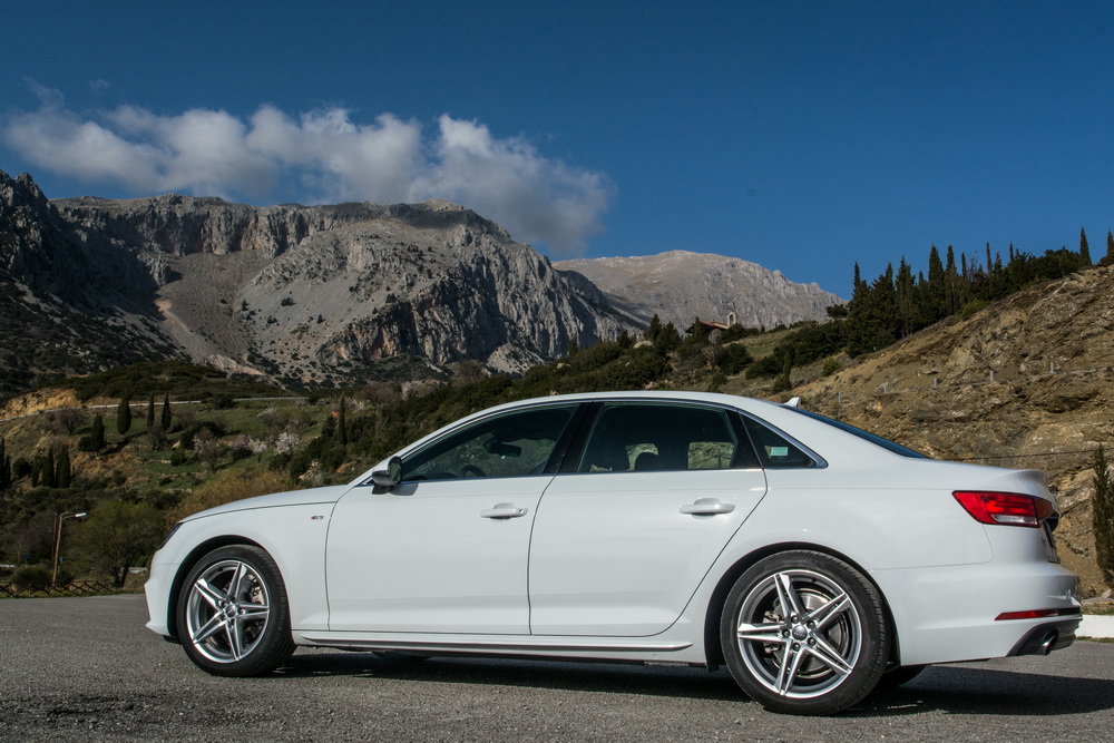 Η αλήθεια είναι ότι το A4, στην πέμπτη γενιά του, ούτε έχει μεγαλώσει δραματικά σε σχέση με τον προκάτοχό του (+25mm), ούτε αποτελεί πείραμα του design. Τα εμπρός φωτιστικά σώματα και η γραμμή που διατρέχει όλο το αμάξωμα στο πλάι, σε συνδυασμό με τις προαιρετικές ζάντες 18'' και την επιθετική στάση της έκδοσης S Line, είναι αρκετά για να το εντάξουν αμέσως στο απαίδευτο μάτι, μία ή δύο κατηγορίες πιο πάνω. Και να κάνουν τους πάντες να υποθέσουν ότι, λογικά,