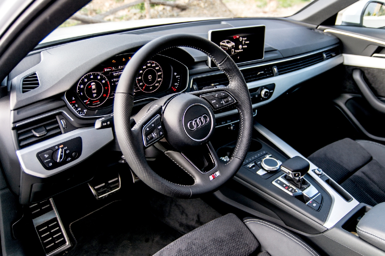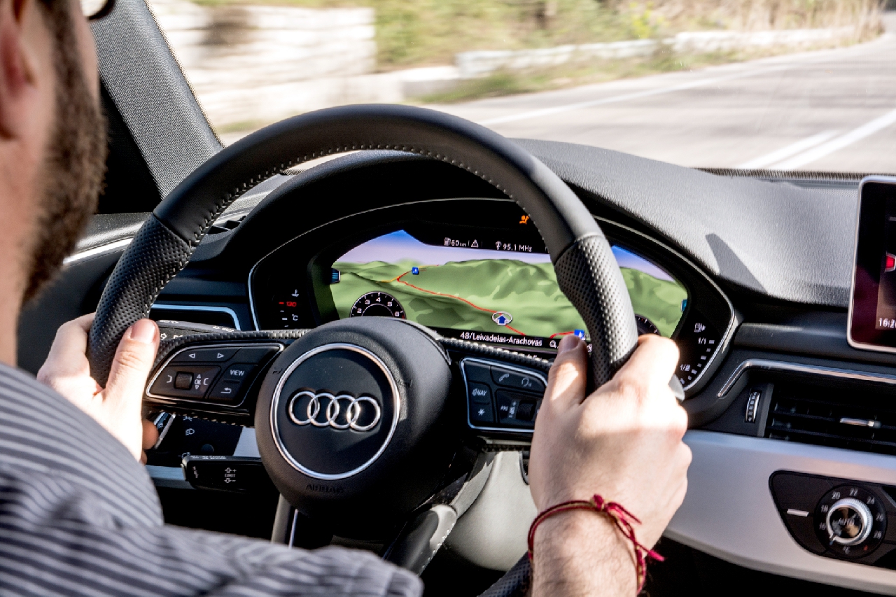 Ωστόσο, ο οδηγός είναι μάλλον ο πιο τυχερός από όλους – το Audi A4 έχει απλώς το καλύτερο εσωτερικό της κατηγορίας του. Μοιάζει να σχεδιάστηκε από μορφές τεχνητής νοημοσύνης που εκπαιδεύτηκαν πρώτα στο πάντρεμα των υλικών και την εργονομία. Θέλεις να αφαιρέσεις το τιμόνι και να το κρεμάσεις στο σαλόνι σου, θέλεις να "πειράζεις” το προαιρετικό touch MMI και να κάνεις φιγούρα στους συνεπιβάτες σου, δεν σταματάς να παίζεις με το virtual cockpit που προαιρετικά αντικαθιστά τα παραδοσιακά αναλογικά όργανα στο ταμπλό με μία υψηλής ανάλυσης οθόνη LCD. Η θέση οδήγησης, ειναι όπως την περιμένει κανείς σε ένα Audi: απόλυτα προσαρμοστική. Τα σπορ καθίσματα του αυτοκινήτου δοκιμής σου θυμίζουν ότι... είναι σπορ, μόνο όταν χρειαστεί: σε δρόμους με στροφές, όπου η έξτρα πλευρική στήριξη είναι αναγκαία. Αλλά πρώτα έχουμε ένα κομμάτι εθνικής μπροστά μας.