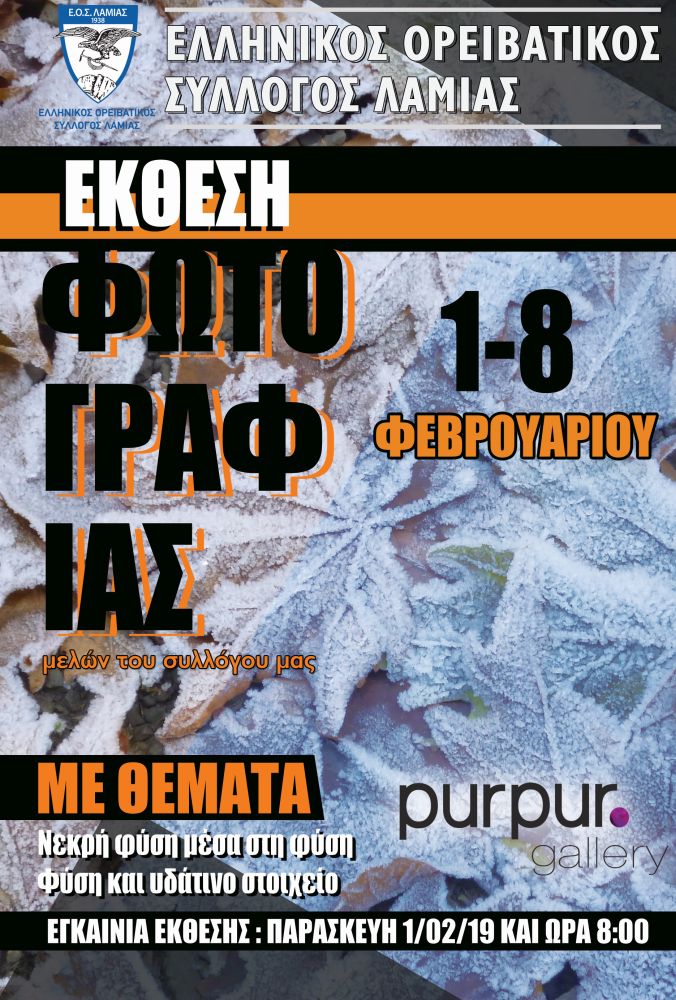 Ο Ελληνικός Ορειβατικός Σύλλογος Λαμίας διοργανώνει έκθεση φωτογραφίας των μελών του με θέματα "Νεκρή Φύση μέσα στη Φύση" και "Φύση και Υδάτινο Στοιχείο".